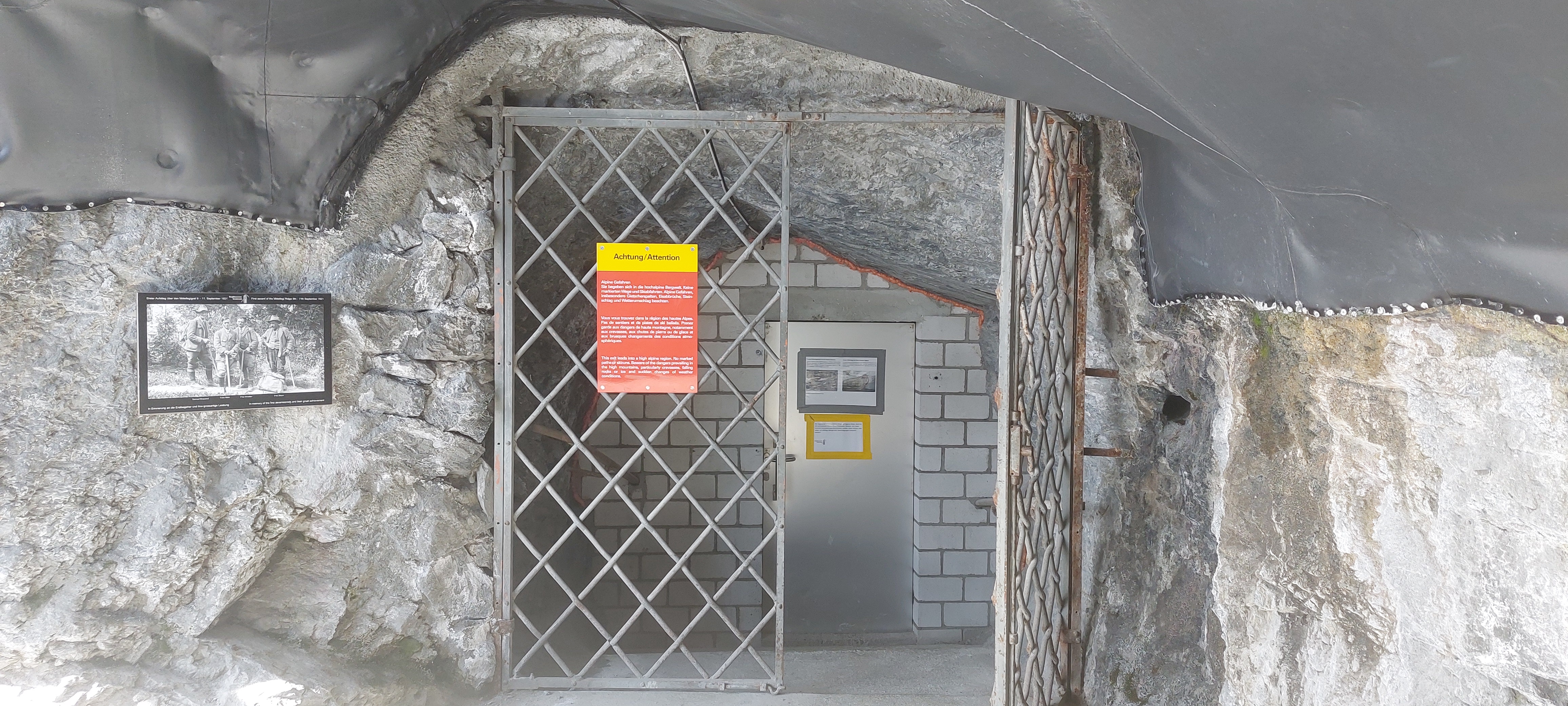 우측으로 경고문이 붙은 철문이 보인다.