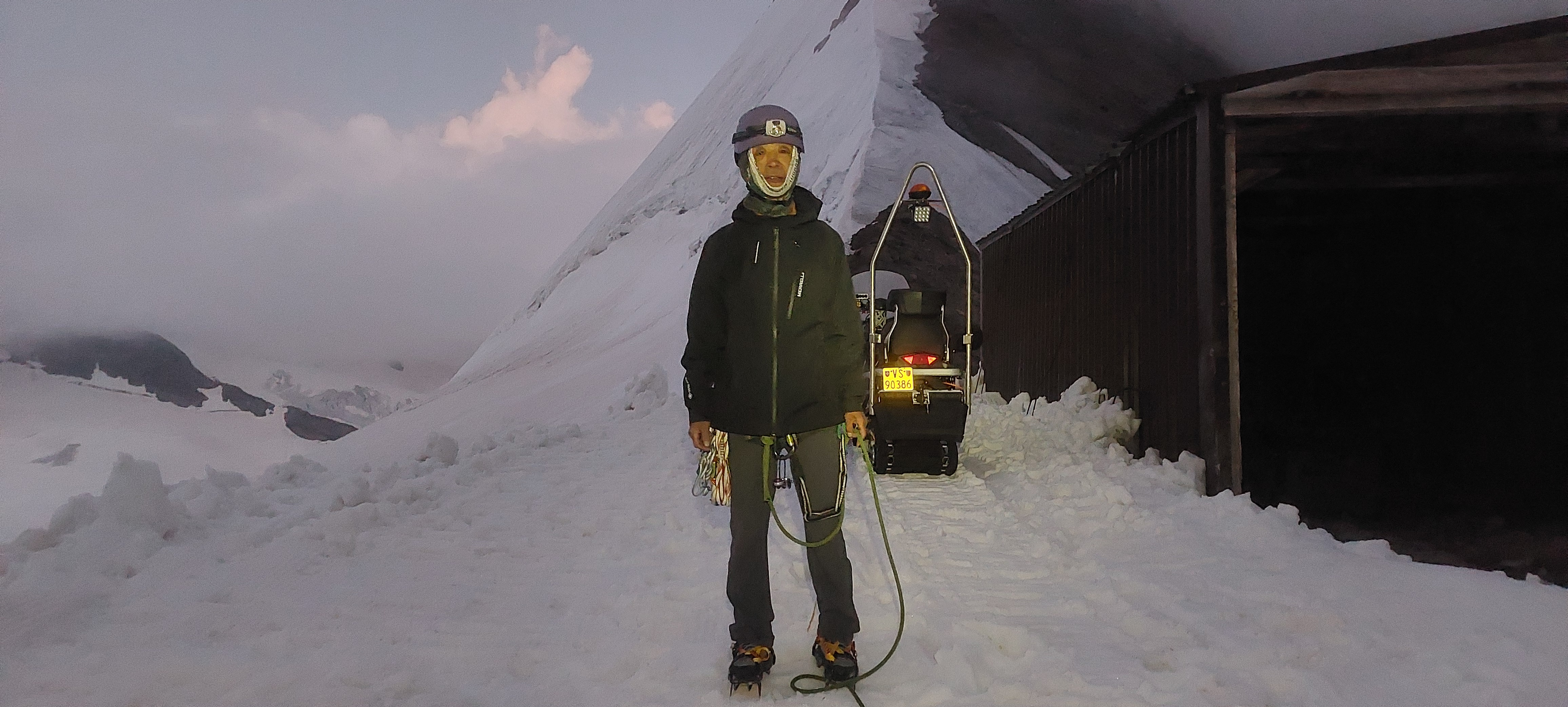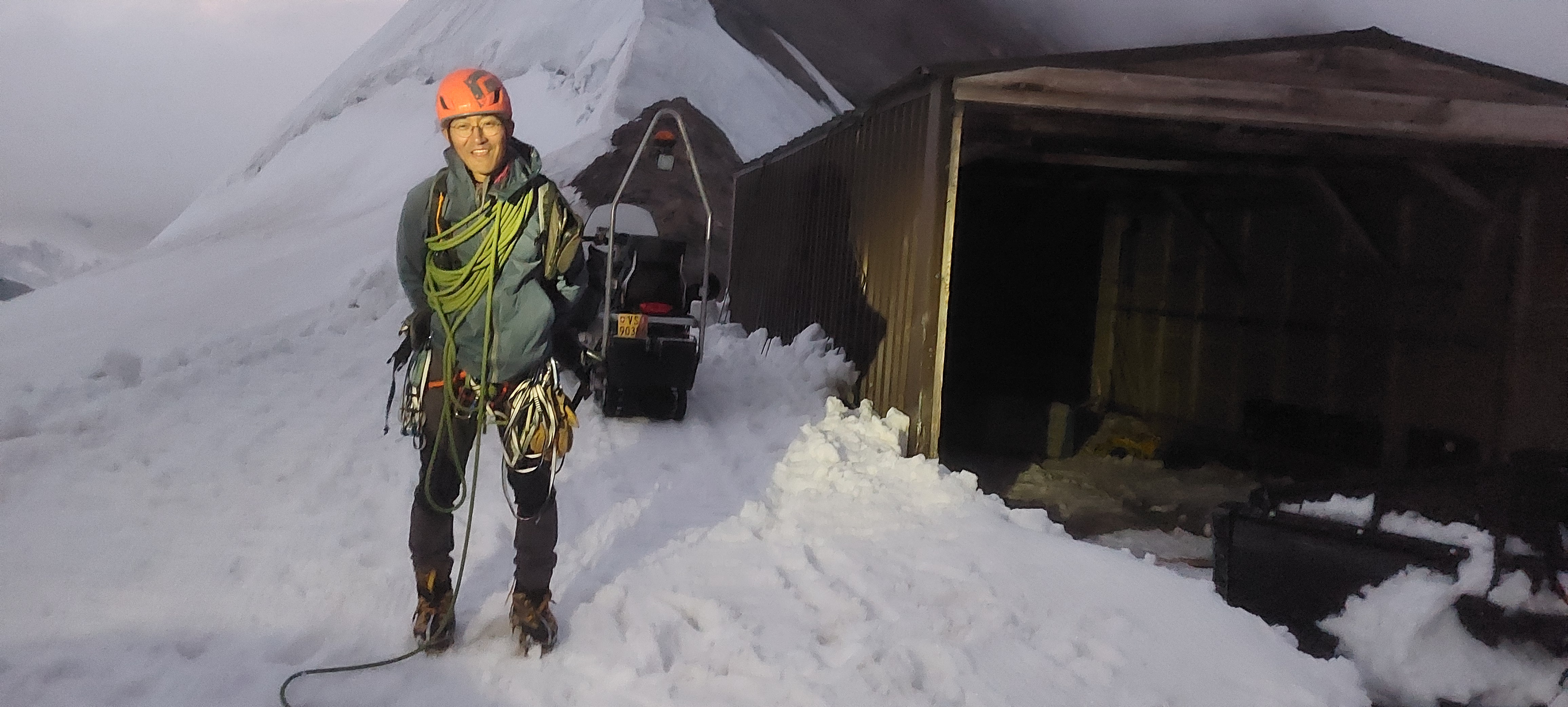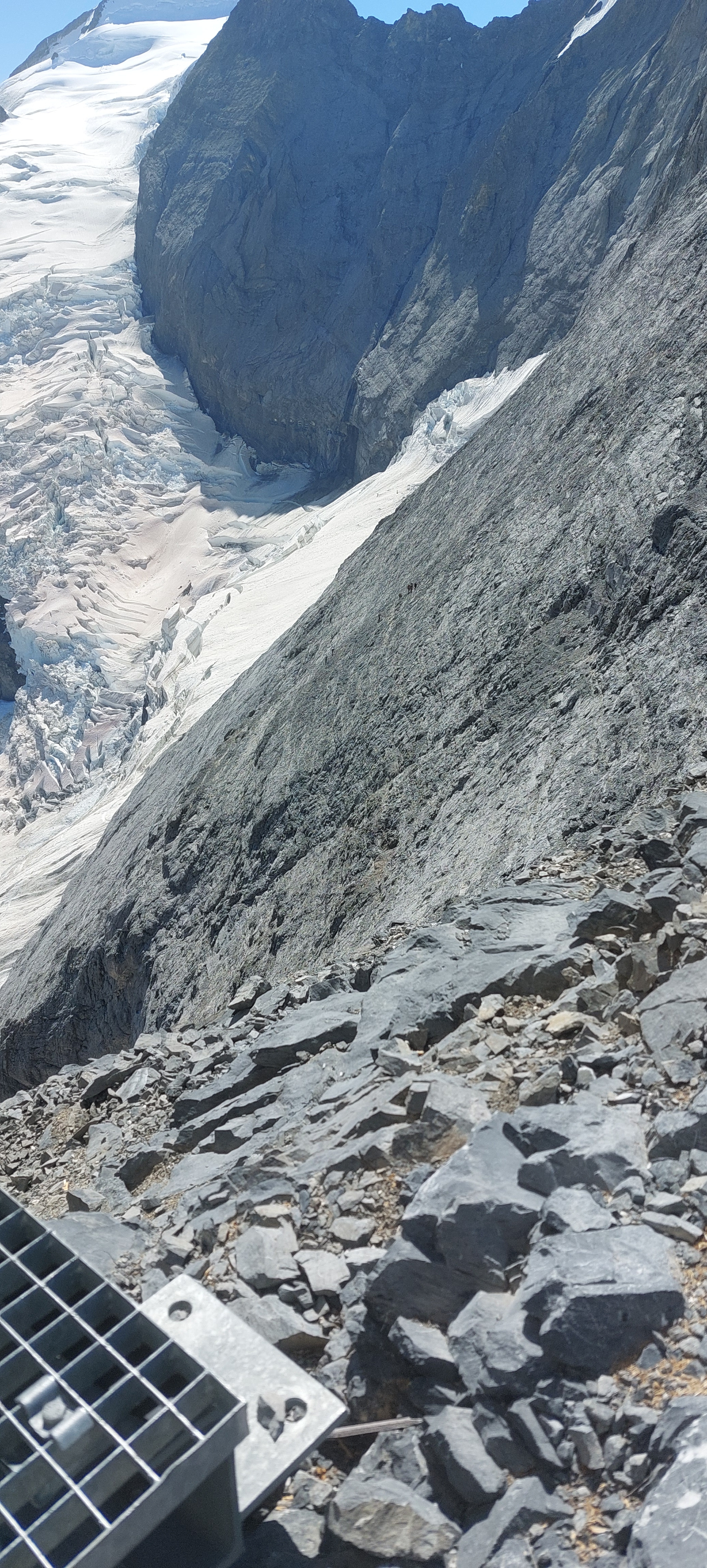 저봉 밑에까지 가서 좌측으로 만년설지대 트래버스하여 묀히 산장으로 가야 한다.
