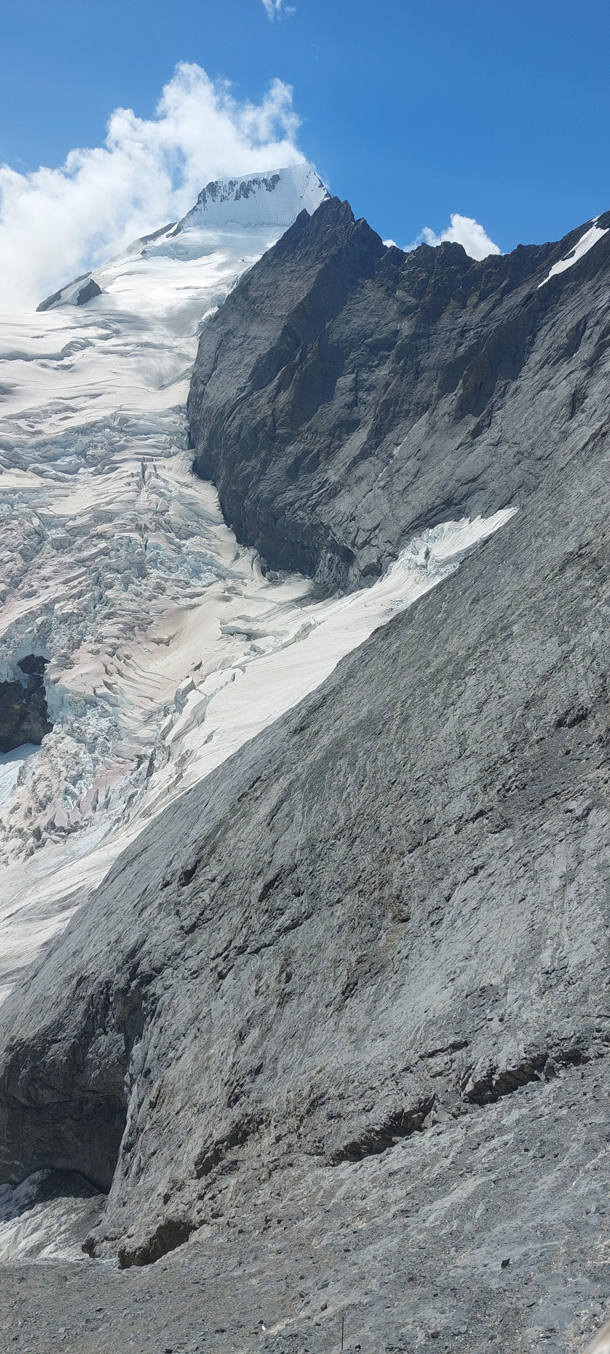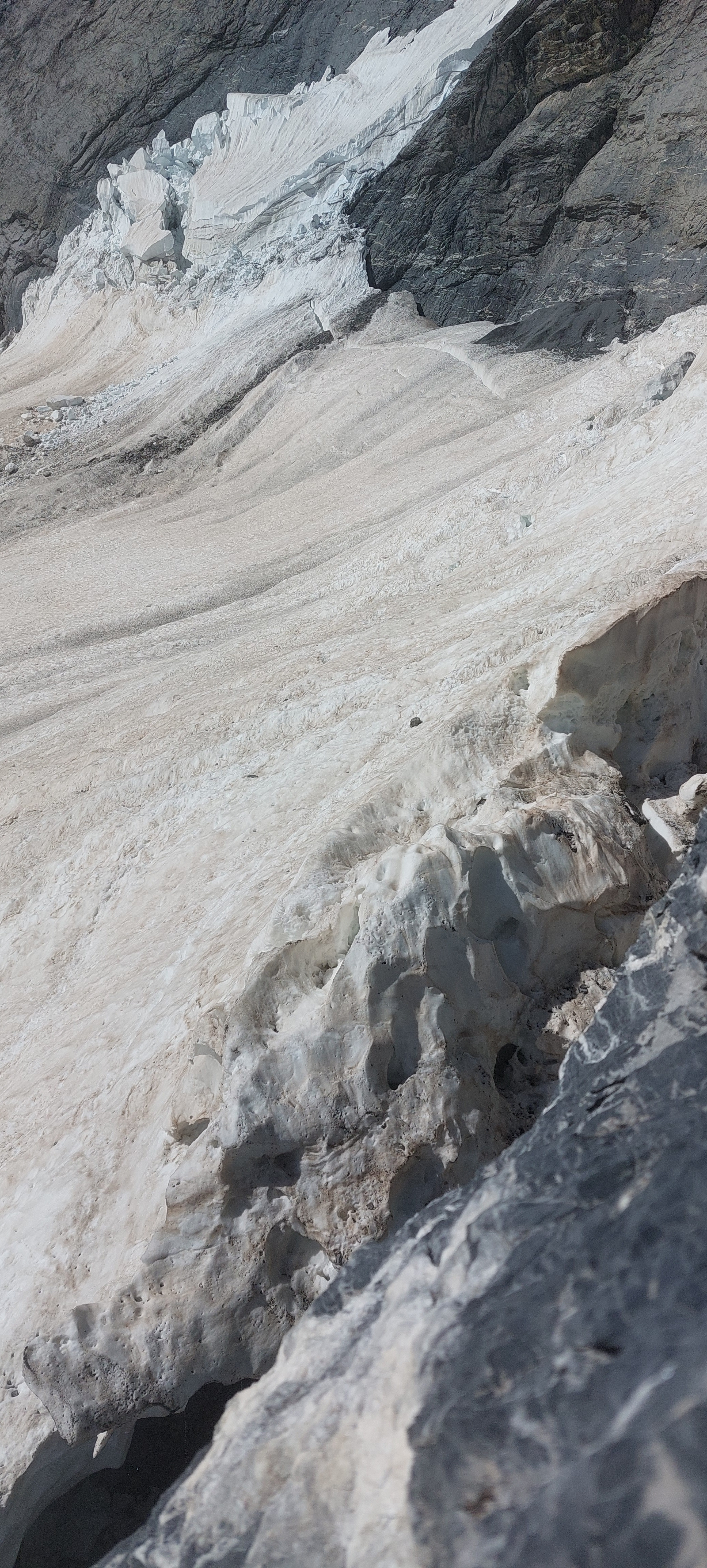 암벽과 만년설 사이가 벌어져있어 그 밑으로 떨어지지 않으려면 조심해야 한다....
