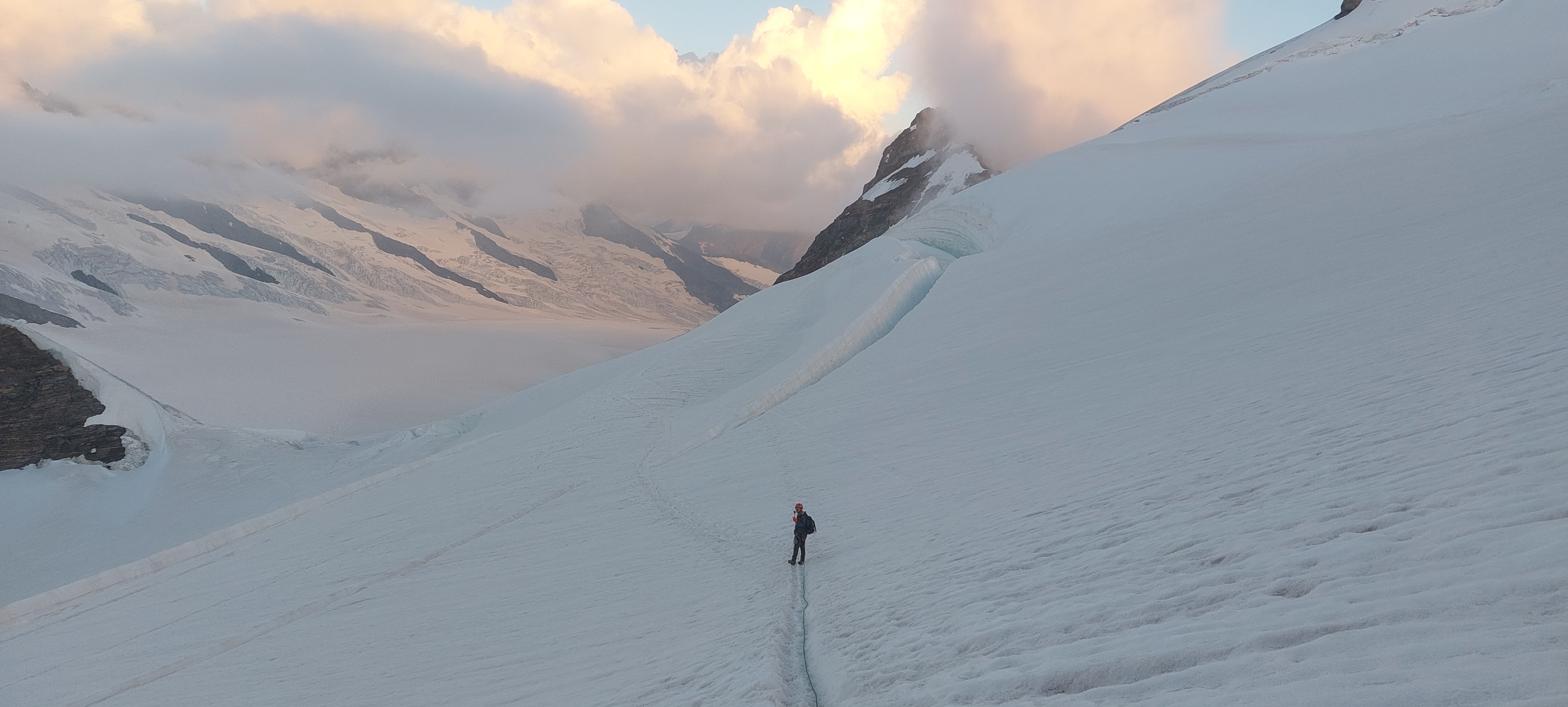만년설 지대에 내려 미텔레기 산장 쪽으로 크레바스를 피해 조심해서 간다.